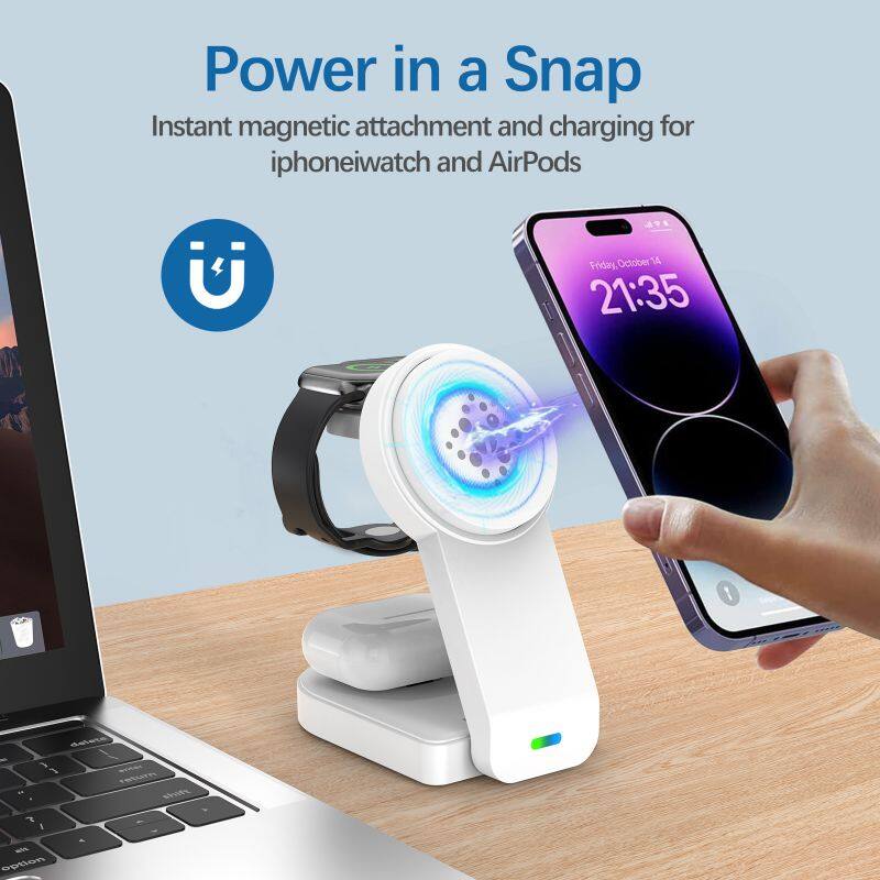 Super Strong Power 3-in-1 Folding Magnetic Wireless Charger for Mobile Phone Smart Watch Earphone With OEM Logo Printing