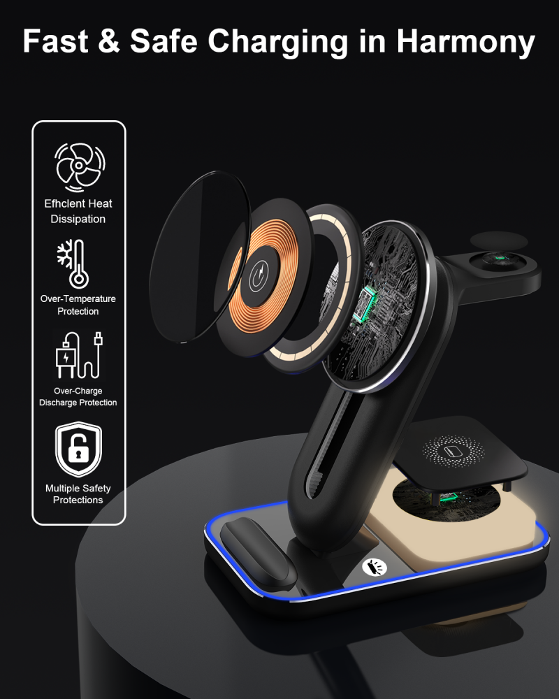 3 in 1 Magnetic Wireless Charger 15W Fast Charging Foldable Stand 360° Rotation With Ambient Light for Apple Watch Earphones