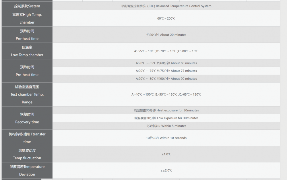 1. The two box equipment is divided into two parts: high temperature zone and low temperature zone. The test product is placed in a basket and during impact, the basket moves the test product into the high temperature or low temperature zone for balancing. The test product is dynamic.