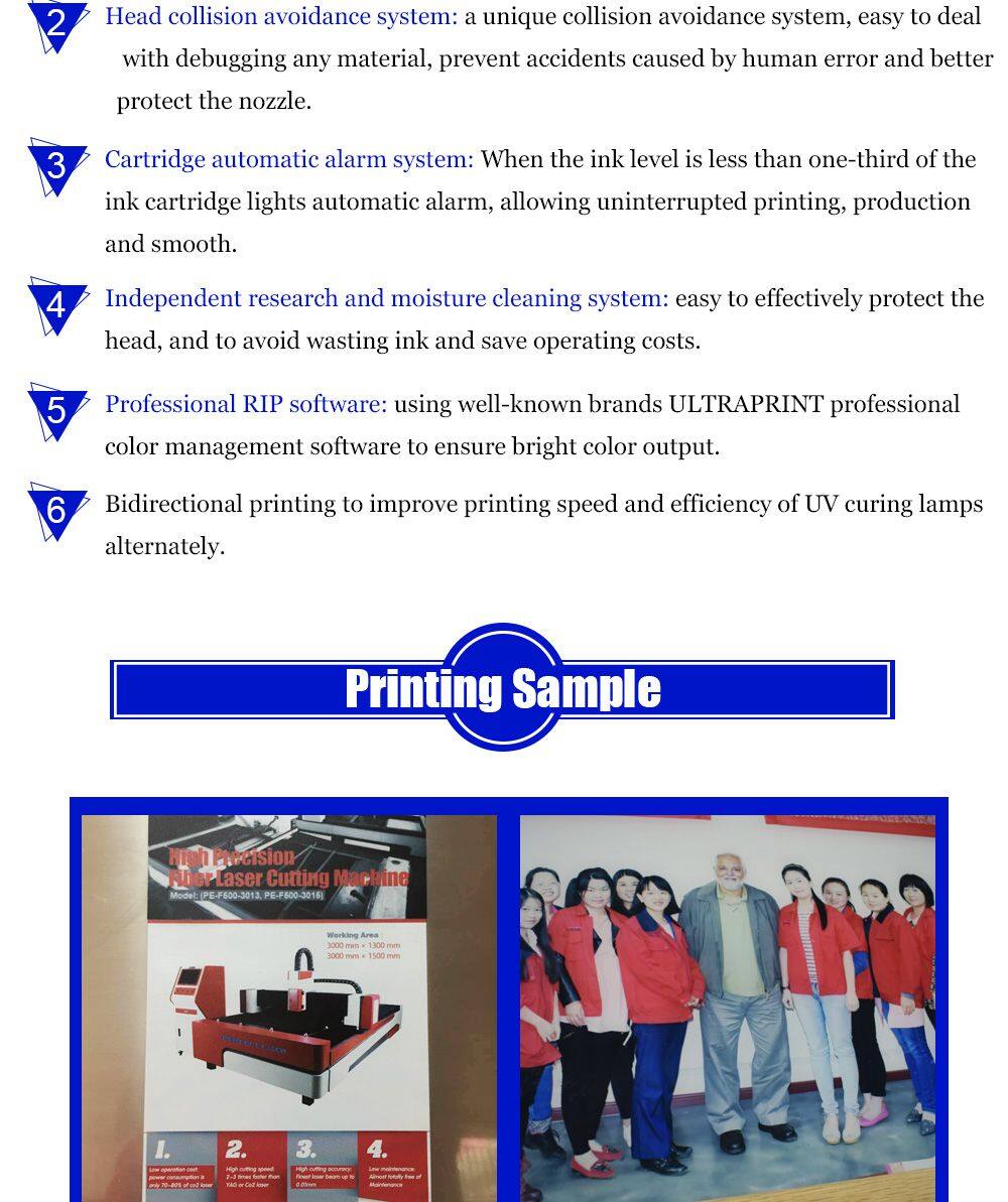 2. Printing head anti-collision system: UV flatbed printing machine can easily deal with any material debugging, avoid accidents caused by human operation error, and better protect printing head.