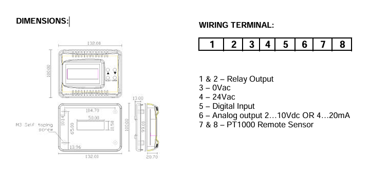 Weight: 2 kg This standalone micro-controller based LCD temperature controller provides proportional plus integral (P+I) and on/off temperature control for commercial Heating, Ventilating & Air Conditioning System such as Hydronic Heating, Air Handling Unit, Heat Exchanger or Condensing Tower. This controller has a modulating analog 2 to 10Vdc or 4 to 20mA output and a 2A on/off output to realize various optional control functions including cool/heat changeover, heat/cool sequence control, emergency interlocking and auto-alarming control. | |