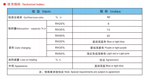 Blue silica gel has the adsorption and moisture-proof effect of narrow pore silica gel, It is characterized by the moisture absorption process, it can become Light blue with the increase of moisture absorption, and finally become light red or light pink. It can indicate the humidity of the environment and also visually show whether a new desiccant needs to be replaced.