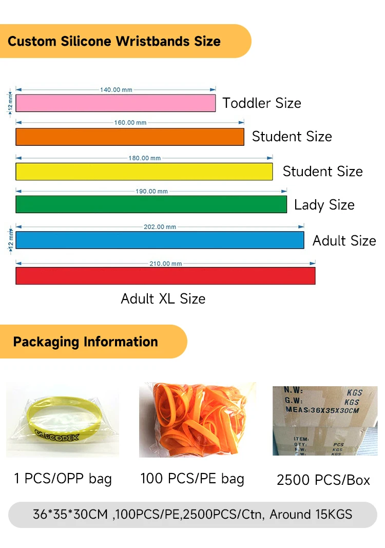 | Product Name | Silicone Wristband Bracelets | Packing | 100pcs/box | |