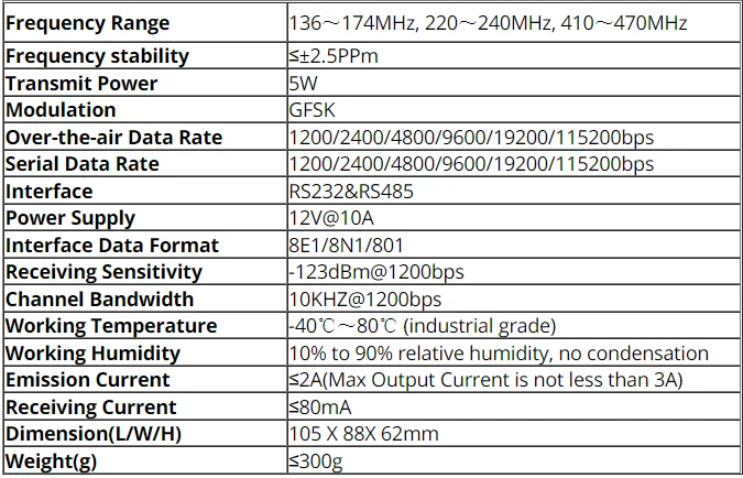 Over-the-air data rate from 1200bps to 115200bps,interface data rate 1200-115200bps user programming;