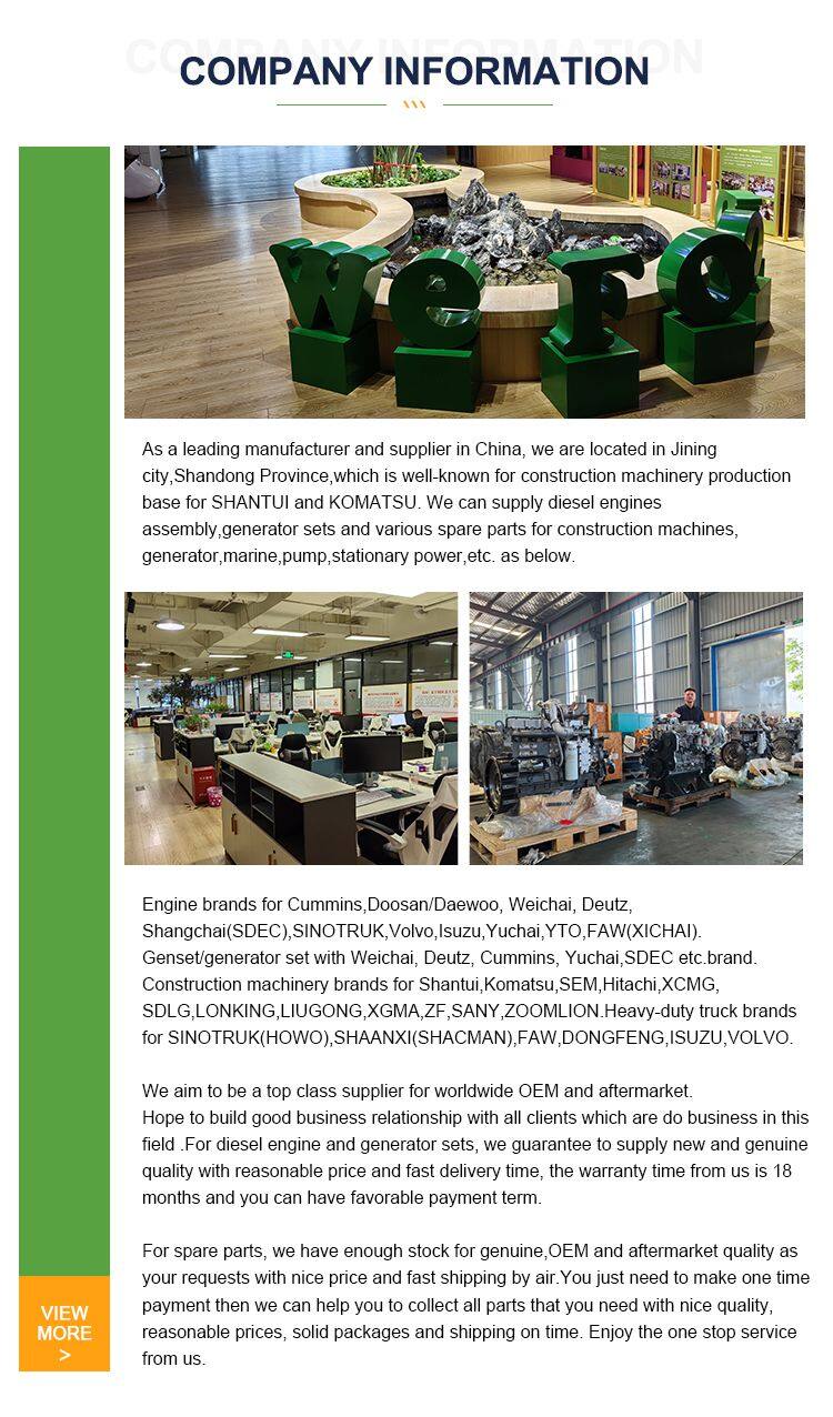 Jining Pinbo Import & Export Co., Ltd is located in Jining city,Shandong Province,which is well-known for production base for Shantui and Komatsu. Pinbo is manufacturer and trading company,it mainly deal in engine assembly,genset(generator set) and spare parts for construction machinery & heavy truck auto parts. The main products and brands are as below:Engine assembly and parts for Cummins,Doosan/Daewoo, Weichai, Deutz, Shangchai(SDEC),SINOTRUK,Volvo,Isuzu,Yuchai,YTO,FAW(XICHAI).Genset/generator set with Weichai, Deutz, Cummins, Yuchai,SDEC etc.brand.Construction machinery parts for Shantui,Komatsu,SEM,Hitachi,XCMG,SDLG,LONKING,LIUGONG,XGMA,ZF,SANY,ZOOMLION.Heavy truck and auto parts for SINOTRUK(HOWO),SHAANXI(SHACMAN),FAW,DONGFENG,ISUZU,VOLVO.Our company owns big warehouse and professional management team, so we can find the right parts quickly for customers with reasonable price, we can supply genuine and OEM parts as customer's request and have warranty time for them.So far,we have exported engines and spare parts to Russia,Uzbekistan,Mongolia,UK,Norway,Sweden,Italy,Nigeria,Tanzania,Mozambique,South Africa,Thailand,Indonesia,PNG,Brazil,Argentina,Peru etc.With the company philosophy of "Honesty, All-win, and sustainability", we sincerely welcome all customers visit our company to talk about business cooperation details.Your requirement is our working direction.