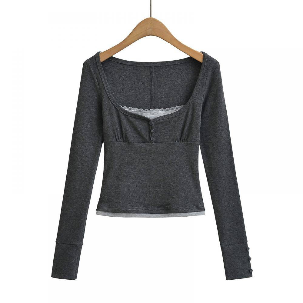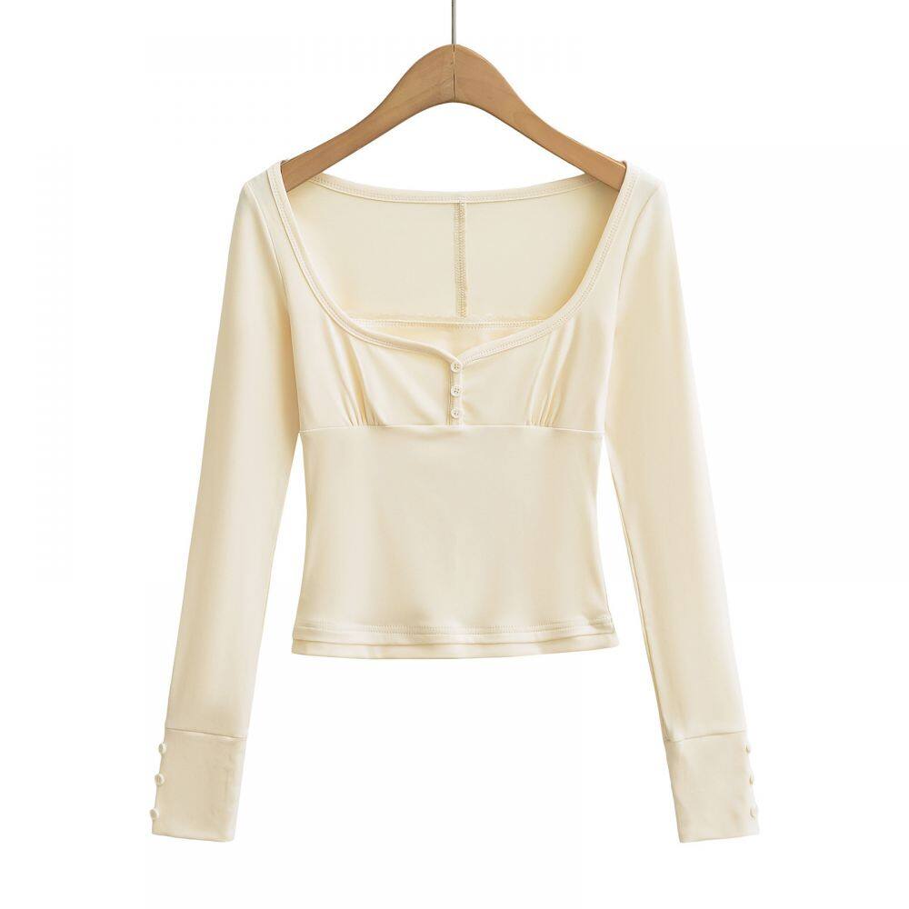 Camiseta T de manga longa com dedos, com senso de design em cor sólida, nicho, feminina, para garotas quentes, com gola U grande, leve, fina e levemente transparente, para usar por baixo