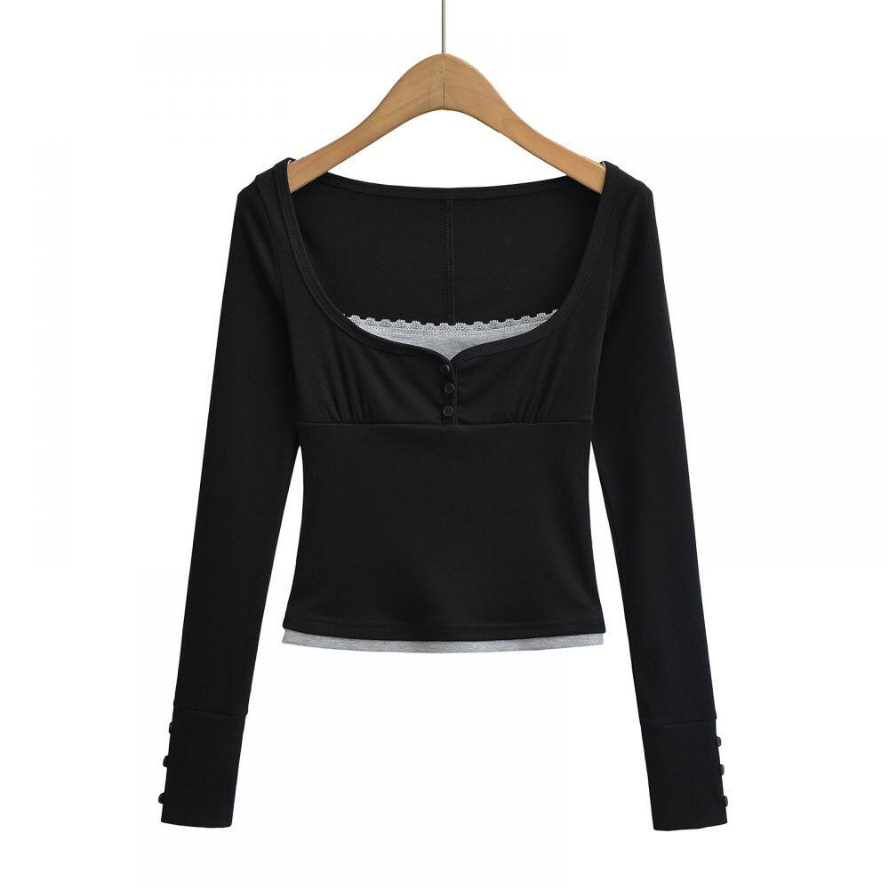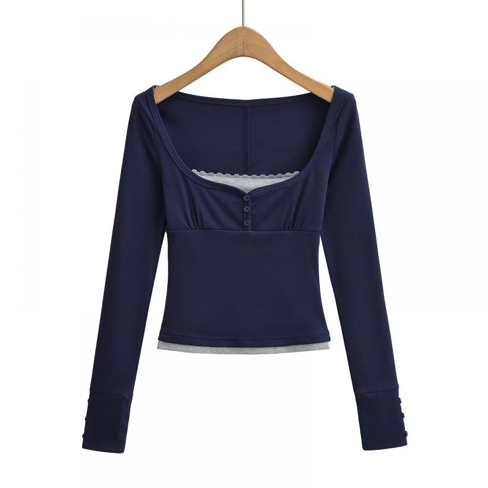 Blusa ajustada e esguichante de estilo americano vintage com renda nas bordas, em dois pe?as com mangas compridas, feita de tecido artificial.