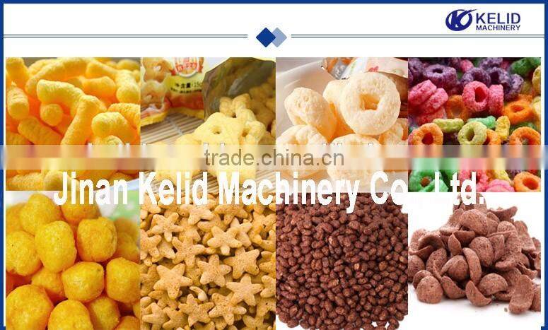 Машина-экструдер для производства снеков из хлопьев вспученного кукурузы разработана и усовершенствована компанией Jinan Kelide Machinery Co., Ltd. на основе передовых технологий. Технические характеристики машины и качество продукции соответствуют самым высоким мировым стандартам. Эта линия обладает такими преимуществами, как гибкая комбинация, широкий ассортимент используемых сырьевых материалов, разнообразие видов снеков и простота в эксплуатации. Она полностью автоматизирована и осуществляет все операции от смешивания, экструдирования, формования, резки, сушки до ароматизации в один проход. Заменяя формы и технологические режимы, можно производить различные формы вспученных снеков, такие как кольца, цветы, шары, полоски, полумесяцы, звезды и т.д. Кроме того, на этой же линии можно производить снеки с начинкой. Все вспученные продукты обладают хрустящим вкусом и легко усваиваются организмом. Они пользуются огромной популярностью как в стране, так и за рубежом.