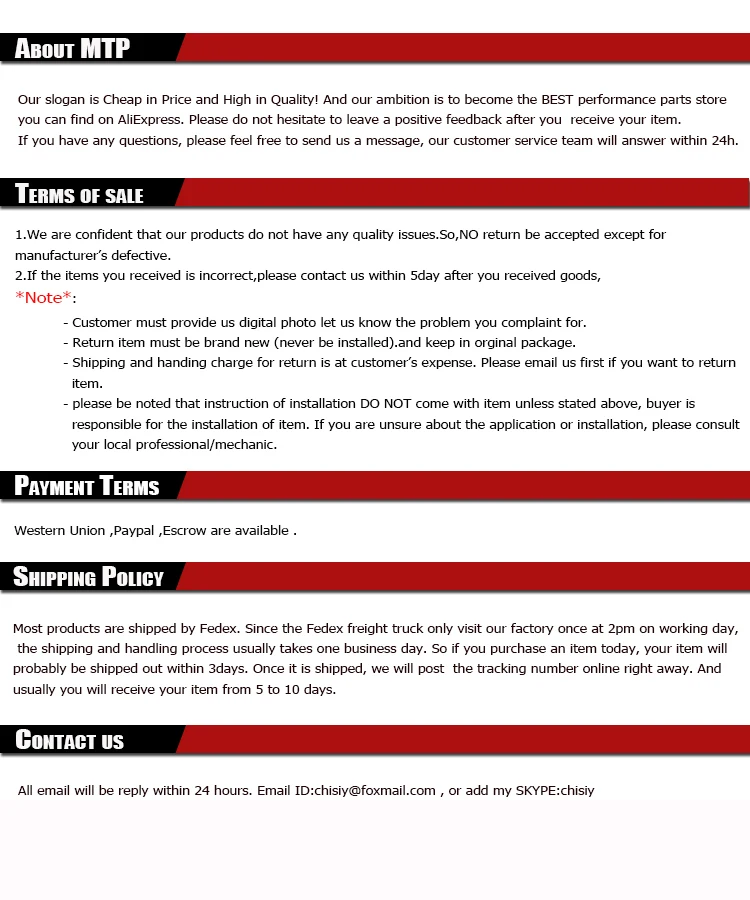 - Основные продукты: Выхлопная труба, Турбокомпрессор, Выхлопной клапан, Система охлаждения, Аксессуары для выхлопной системы, Детали двигателя, Радиатор, Термоизоляция выхлопной системы, Отводной клапан, Турбокомплекты, Детали для квадроциклов, Прочее