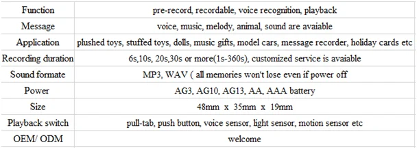 Применение: плюшевые игрушки, набированные игрушки, куклы, музыкальные подарки, записыватели сообщений, игрушки для детей, праздничные открытки и т.д.