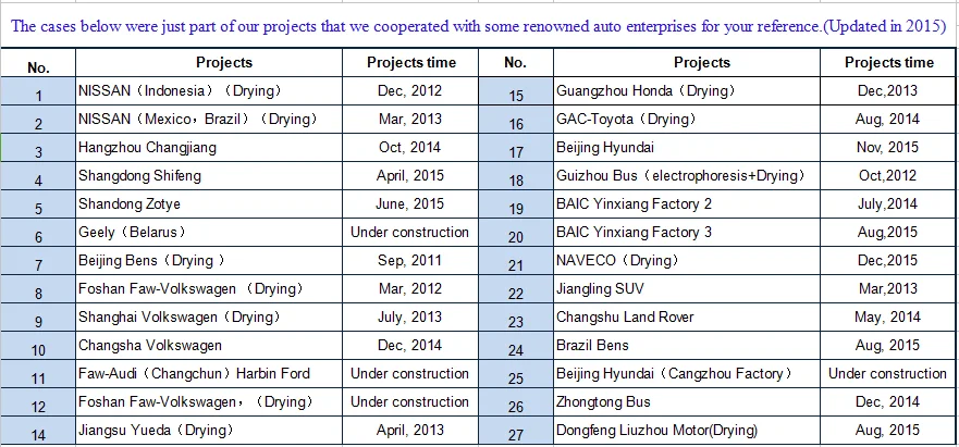* XINHOU насадки успешно выполняют задачи сушки и покрытия в процессе автопредварительной обработки. Мы сотрудничаем с некоторыми мировыми известными компаниями в рамках крупных автопроектов, таких как Audi, Bens, BMW и др.