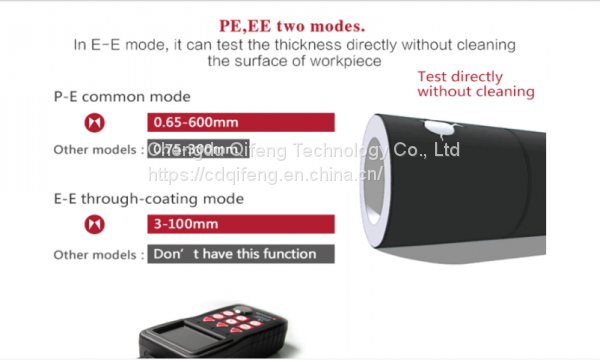Широкий диапазон измерений:Режим импульс-эхо: (0,65-600) мм (для стали). Режим эхо-эхо: (2,5-100) мм