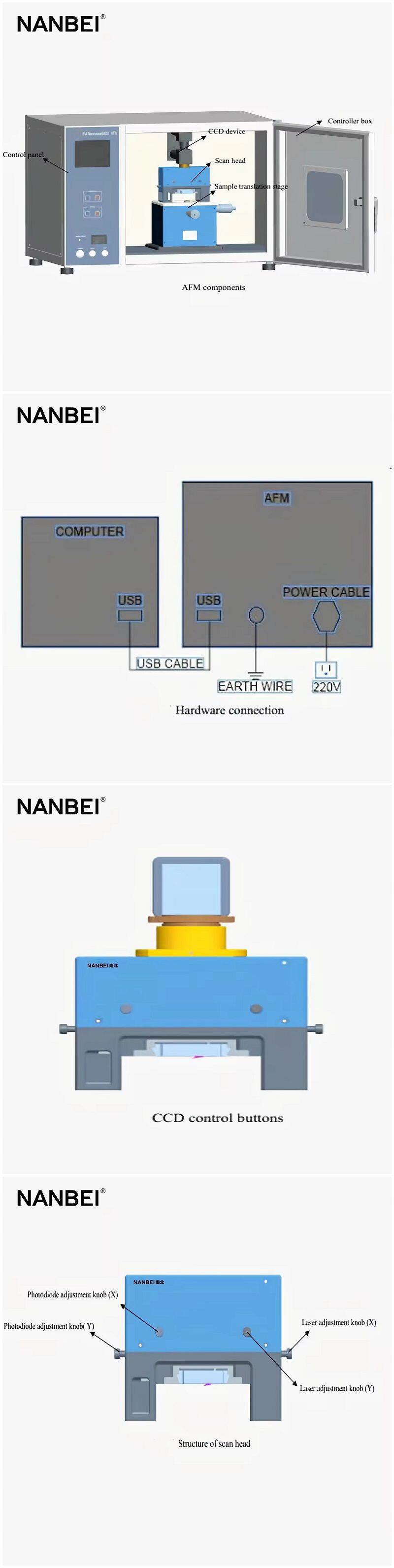Моноблочное исполнение, интеллектуальная конструкция и форма. Голова сканера и столик для образца спроектированы вместе, высокая устойчивость к вибрациям. Точная лазерная система детектирования и приспособление для совмещения зонда позволяют легко регулировать лазер. Используется серводвигатель для привода приближения образца к наконечнику вручную или автоматически, чтобы обеспечить точное позиционирование области сканирования. Высокоточный и широкодиапазонный механизм перемещения образца позволяет сканировать любую интересную область образца; различные типы сканеров удовлетворяют требованиям разных клиентов по точности и размеру сканирования; оптическая система наблюдения для контроля наконечника и позиционирования образца. Система наблюдения на основе CCD для наблюдения и позиционирования области образца в реальном времени; серводвигатель используется для автоматического фокусировки CCD. Электронная система выполнена модульной, проста в обслуживании и развитии. Интегрирована с электронными блоками управления многими режимами работы для дальнейшего развития.