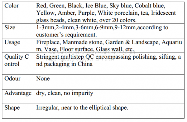 - Основные продукты: стеклянные бусины, стеклянные хлопья, стеклянные заполнители, Рециклированные стеклянные заполнители, стеклянные галки, стеклянный блок, стеклянный камень, терраццо-стекло, светящийся в темноте стекол, твёрдоостеклянный стекол, дробленый стекол, дробленые осколки зеркала