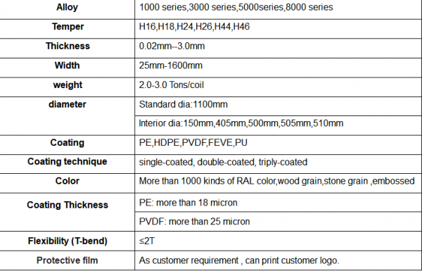 Технические характеристики цветной алюминиевой рулонной листовой стали |