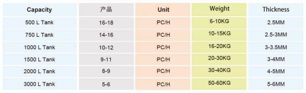 Машина для выдувной формовки водяных емкостей объемом 3000 л может производить водяные емкости объемом от 500 л до 3000 л.