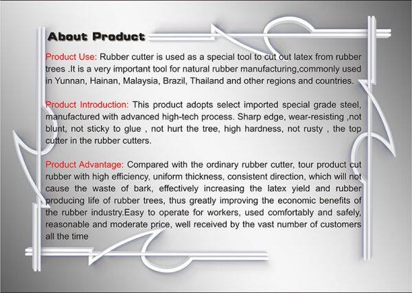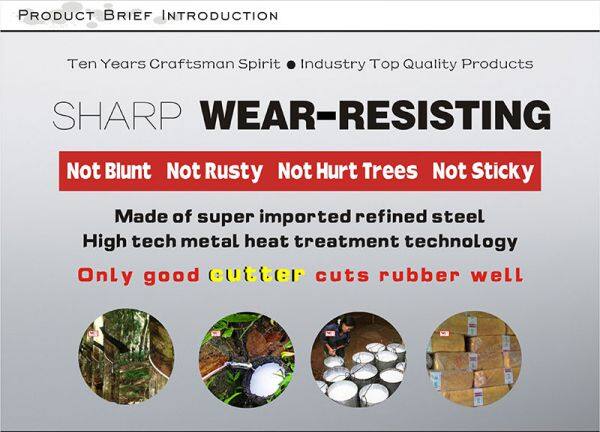 ????????Резец для резины используется как специальный инструмент для срезания латекса с каучуковых деревьев. Это очень важный инструмент для производства натуральной резины, широко применяемый в регионах и странах, таких как Юньнань, Хайнань, Малайзия, Бразилия, Таиланд и др.
