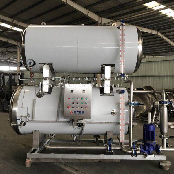Полностью автоматическая двухслойная автоклава с погружением в воду имеет верхнюю и нижнюю емкости. Верхняя предназначена для экономии воды, а нижняя - для стерилизации. После того, как упакованная продукция поступает в стерилизационную емкость, предварительно нагретая стерилизационная вода из верхней емкости поступает в нижнюю стерилизационную емкость и заливает всю продукцию в емкости. Затем циркуляционный насос заставляет высокотемпературную воду в емкости регулярно циркулировать. В процессе работы пар постоянно нагревает воду до заданной температуры для осуществления стерилизации упакованной продукции. После завершения стерилизации высокотемпературная вода возвращается в верхнюю емкость, а охлаждающая вода подается непосредственно в нижнюю емкость извне для завершения процесса охлаждения.