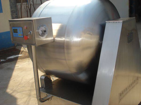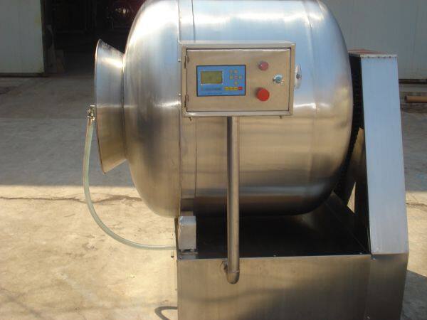 Вакуумный мясной барабанный месильщик находится в вакуумном состоянии. По физическому принципу удара мясо вращается вверх и вниз внутри барабана, сталкиваясь, бьясь друг о друга, что приводит к равномерному распределению массажа и вкуса мариновки. Мясо может равномерно впитывать маринад, увеличивая адгезию и эластичность мяса. Когда в машину уже введен расслабляющий агент для мяса, барабан устройства медленно и плавно вращается, обеспечивая равномерное сжатие и массаж мяса, ускоряя высвобождение солеворастворимых белков в мясе, и одновременно обеспечивая слияние добавленных веществ (крахмала и т. д.) с белками мяса, улучшая структуру мяса и увеличивая выход продукции. Дальнейшие продукты обладают такими характеристиками, как омягчение мяса, увеличение влагоудерживающей способности мяса, хороший вкус, красивый цвет и текстура, красивый нарез и высокий выход продукции.