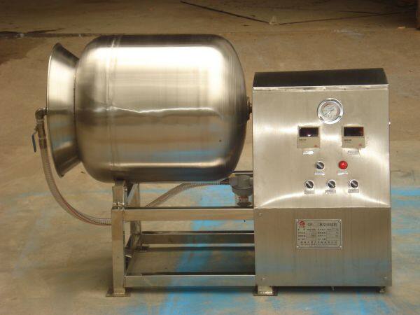 Вакуумный мясной турблер работает в вакуумном состоянии. По физическому принципу удара он заставляет мясо скатываться вверх и вниз внутри барабана, сталкиваться друг с другом, биться, что приводит к равномерному распределению массажа и вкусно-маринованного эффекта. Мясо может равномерно впитывать маринад, увеличивая адгезию и эластичность мяса. Когда в машину введен мясомягчающий агент, барабан устройства медленно и плавно вращается, обеспечивая равномерное сдавливание и массаж мяса, ускоряя высвобождение соле-растворимых белков в мясе, а также обеспечивая слияние добавленных веществ (крахмала и т.д.) с белками мяса, улучшая структуру мяса и увеличивая выход продукции. Дальнейшие характеристики продукта включают мягчение мяса, увеличение водоудерживающей способности мяса, хороший вкус, красивый цвет и текстура, прекрасное нарезание и высокий выход продукции.