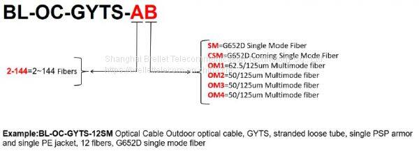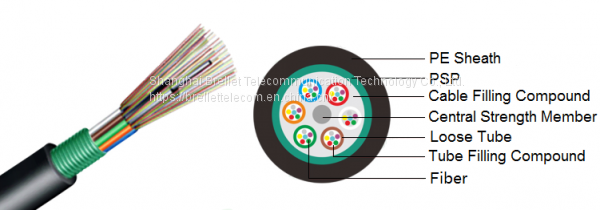 Конструкция GYTS заключается в том, что волокна диаметром 250 мкм расположены в свободной трубке, изготовленной из высокомодульного пластика и заполненной гидроизолирующей заливочной смесью; Стальной проволочный жиль, иногда обмотанный полиэтиленом (ПЭ) для кабелей с большим количеством волокон, расположен в центре сердцевины в качестве металлического силового элемента; Трубки запутаны вокруг силового элемента в компактную и круглую сердцевину кабеля; ПСП (стальной лента) продольно нанесена на сердцевину кабеля, которая заполнена заливочной смесью, для защиты от проникновения воды; Кабель завершается полиэтиленовой (ПЭ) оболочкой.