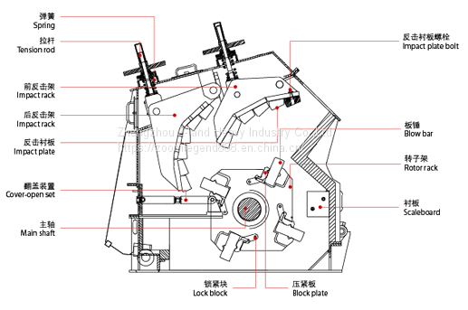 Тяжелонагрузочный молотковый дробилка состоит главным образом из электродвигателя, шкива и ротора с молотками. Ротор состоит из главного подшипника, стола, пальца и молотка.