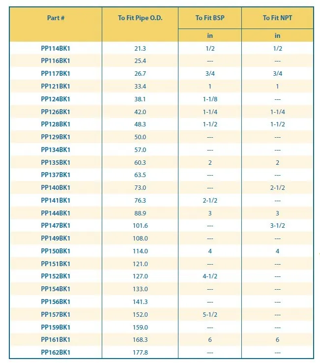 Наши заглушки серии PP изготовлены из черного полиэтиленового пластика и имеют размеры для установки на резьбы от 1/2 до 6 NPT или от 1/2 до 6 BSP или от 21.3 мм до 177.8 мм.