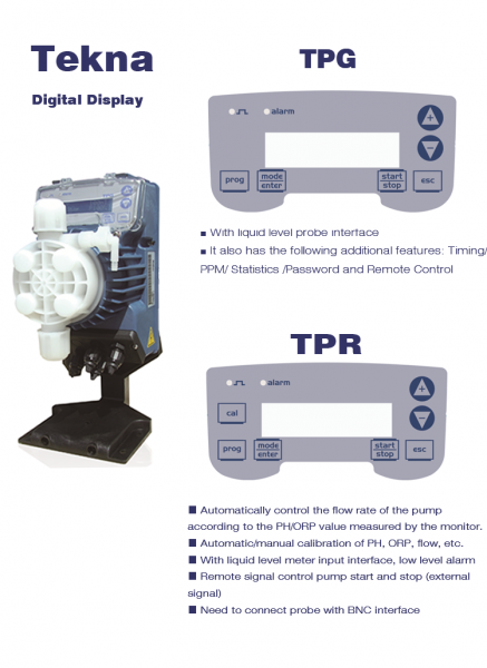 Tekna состоит из пяти мембранных насосов, которые обычно обеспечивают точный уровень хлора в стехиометрии бассейнов, а также подают антибиотики в питьевую воду для скота.