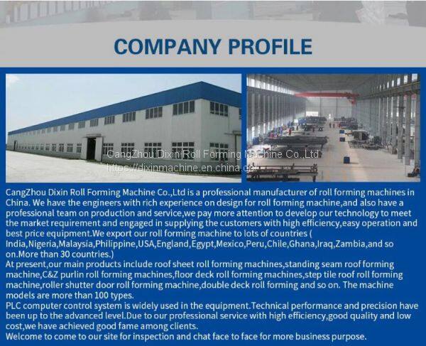 Cangzhou Dixin Roll Forming Machine Co.,Ltd,Наша компания является профессиональным и ведущим производителем, способным производить, проектировать, устанавливать и отлаживать различные станки для профилирования листового металла и оборудование для обработки металлических листов, которые производят металлические кровельные и стеновые панели, облицовочные черепицы, С-образные стальные фермы, настольные поверхности, кровельные гребни,сэндвич-панели, кровельные фермы, жалюзиные панели, жалюзиные ламели, дверные рамы, ограждения, а также разматыватели металлических листов, станки для гибки, продольной резки, резки, выравнивания, перфорации, скругления. Особенно мы способны проектировать станки по запросам клиентов.