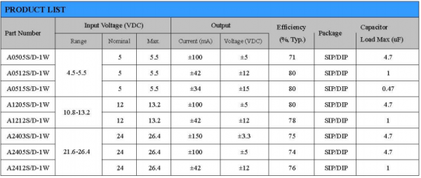 Миниатюрные изолированные необрегулируемые преобразователи DC/DC мощностью 1 Вт и напряжением 3 кВ постоянного тока