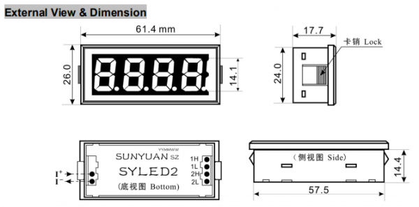SY LED2 Размеры: 61,4×26,0 мм, Высота: 17,7 мм, внешняя оболочка изготовлена из огнезащитной пластики. Измеритель предназначен главным образом для отображения сигналов датчиков, передатчиков или управляющих измерительных приборов. Размеры перфорации панели индикаторного измерителя: 57,5x24,0 +0,2 мм