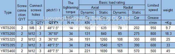 ???? YRTS series ограничивающая скорость выше, чем у серии YRT. Высоскоростные подшипники вращающихся столов серии YRTS, как и базовые подшипники вращающихся столов серии YRT, имеют конструкцию с двумя осевыми компонентами и одним радиальным компонентом: осевой компонент содержит две сборки осевых цилиндрических роликовых обойм, наружный кольцо, внутреннее кольцо L-образного сечения и второе кольцо. После сборки устанавливается осевой преднагруз. Радиальный компонент содержит сборку цилиндрических роликовых обойм, радиальная преднагрузка также добавляется после сборки. На наружном кольце, внутреннем кольце L-образного сечения и втором кольце есть крепежные отверстия. Узел фиксируется с помощью зажимных винтов для безопасности транспортировки и обработки. Высоскоростные подшипники серии YRTS могут использоваться на валах, приводимых прямым приводным двигателем. (HONBbearing06)