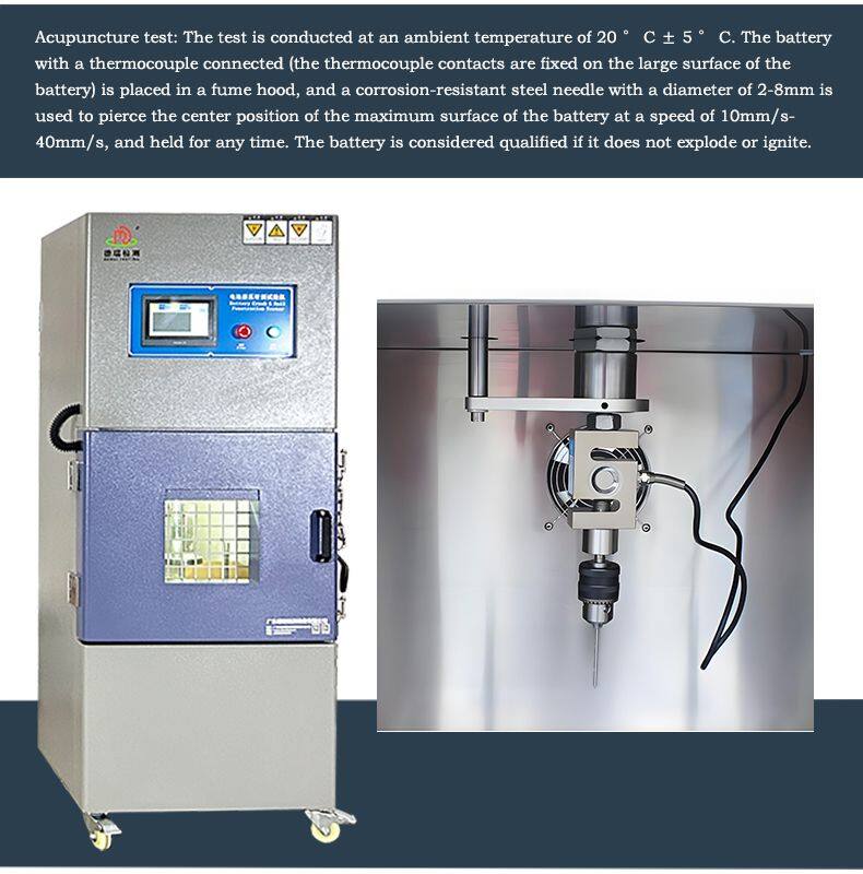 Puncture Device: Utilizes a specially designed needle or probe to penetrate the battery at a set speed and force, mimicking potential physical damage encountered during use.