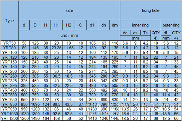 П?дшипники основного вращательного стола YRT оснащены радиальным полным роликовым подшипником, двумя группами осевых игольчатых роликов, клетьевой сборкой, наружным кольцом, внутренним кольцом в форме латинской буквы L и вторым кольцом. На наружном и внутреннем кольцах имеются крепежные отверстия, поэтому болты могут напрямую закреплять подшипники. Конструкция подшипников вращательного стола YRT может воспринимать двунаправленную осевую нагрузку, радиальную нагрузку и перекосный момент. Подшипники этой серии имеют предварительную нагрузку до отгрузки с завода, поэтому при монтаже не требуется регулировка зазоров. Подшипники этой серии особенно подходят для ситуаций с высокой точностью, высокой жесткостью, низкой скоростью и коротким периодом вращения, таких как вращательные столы, делительные головки и вращающиеся фрезерные головки.