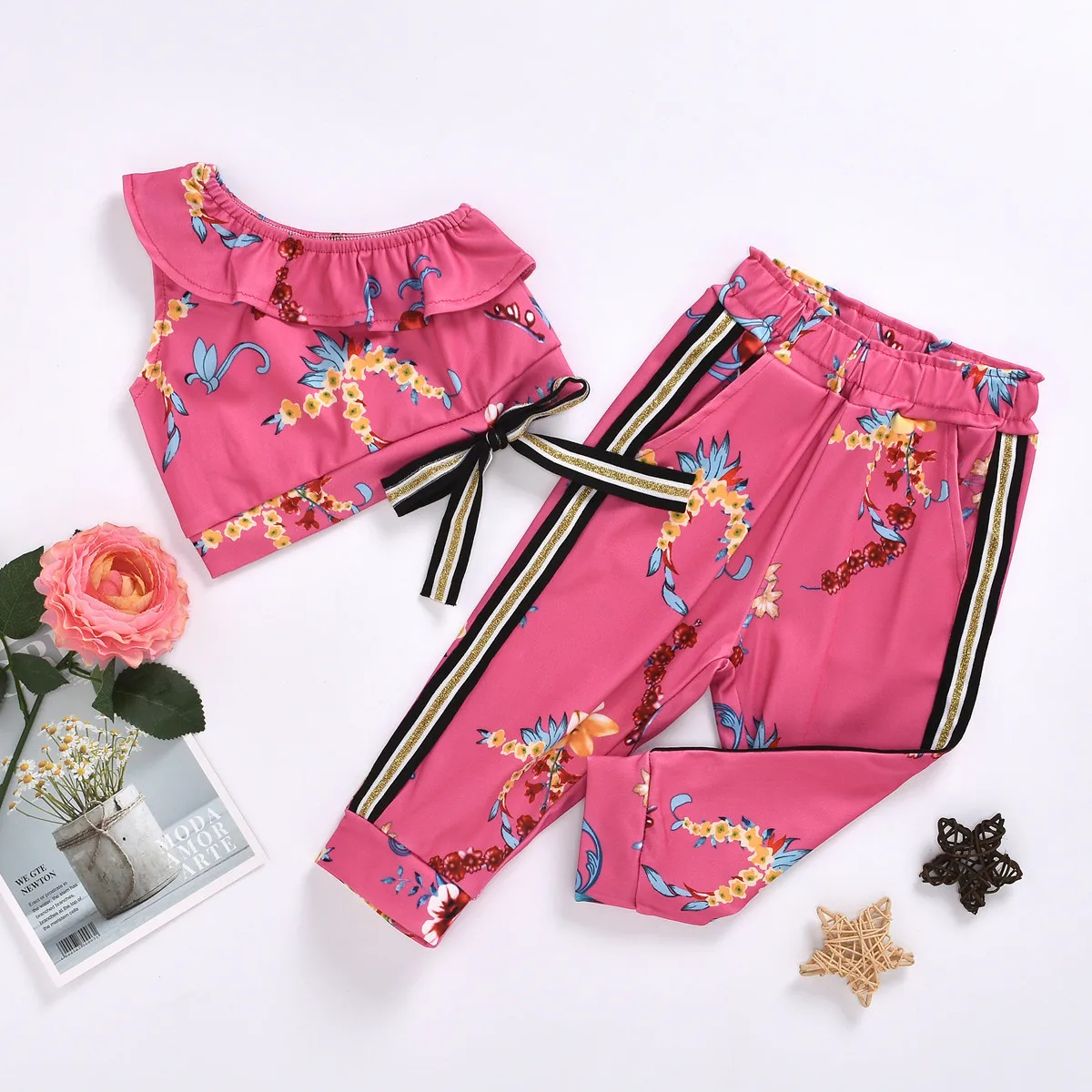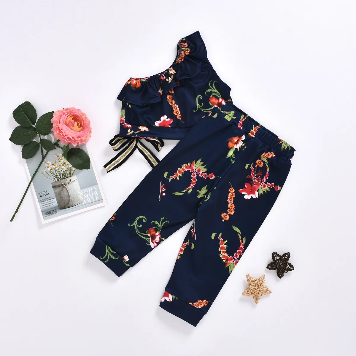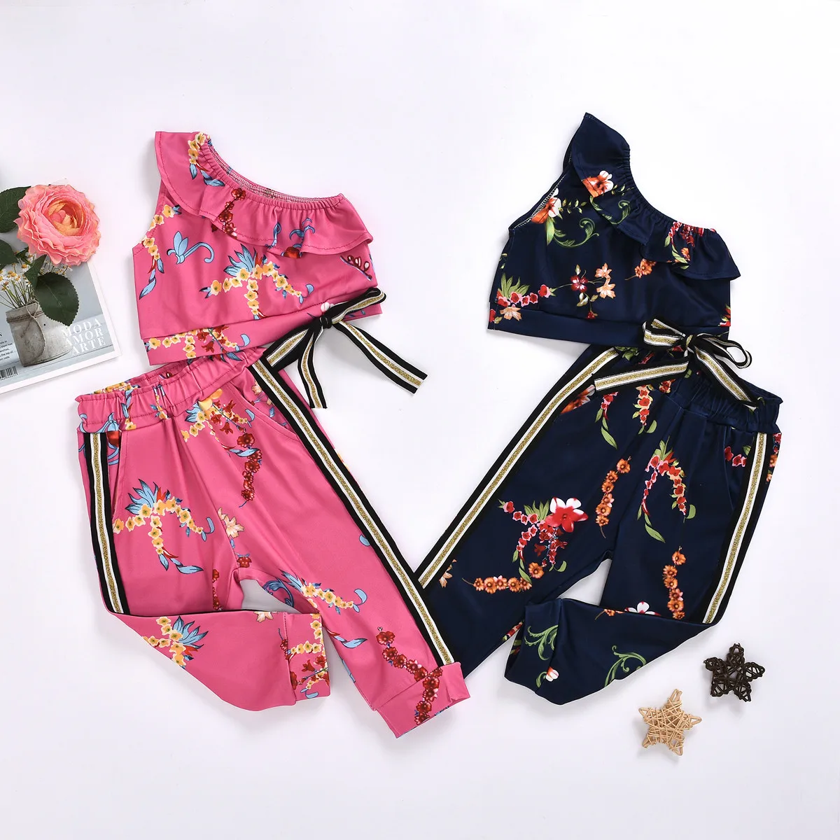 Летние костюмы для девочек - набор из 2 штук: блузка для младенцев + брюки. Детская одежда, с цветочным узором, складками, эластичными вставками, пушистыми рукавами