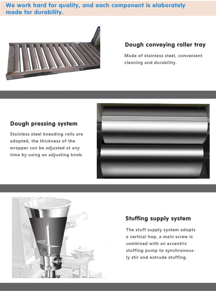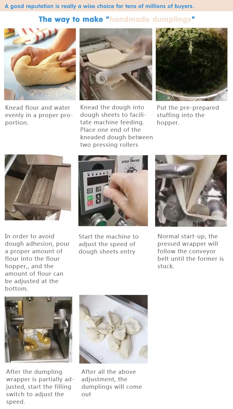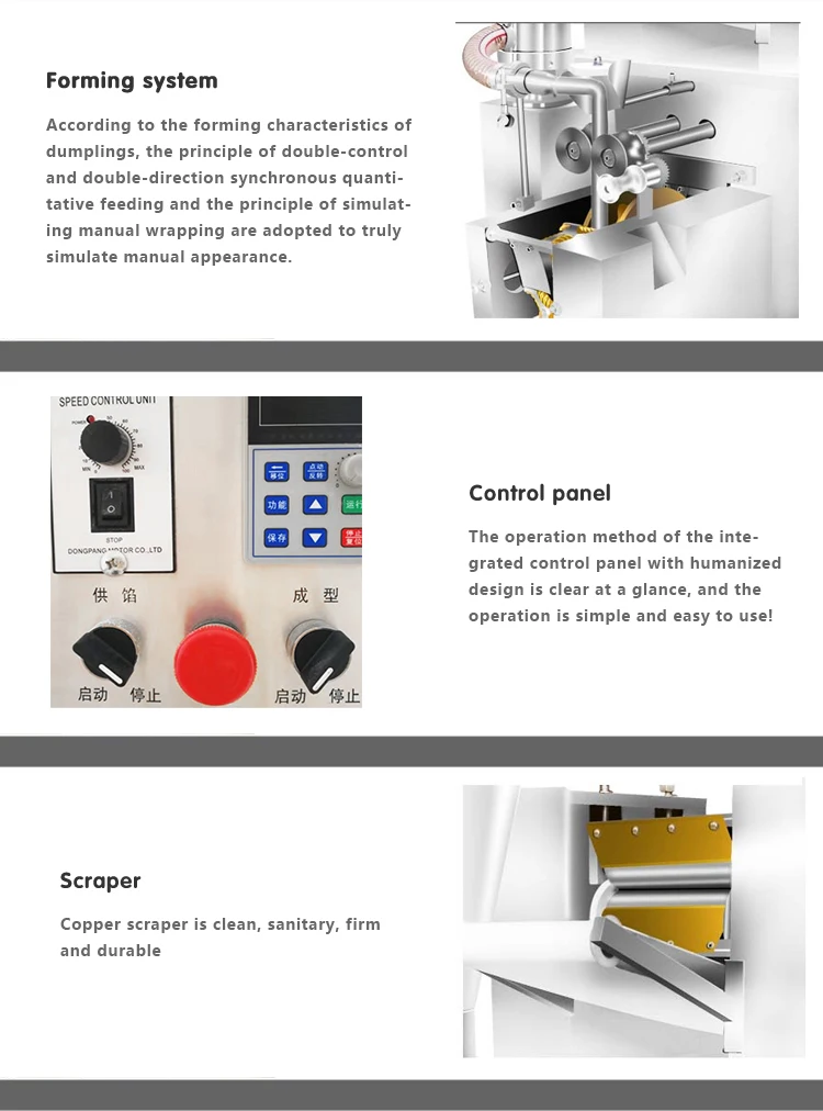 Эта машина для приготовления пельменей использует новейшую точную технологию и является настоящей ручной машиной для приготовления пельменей без формирования. Скорость машины может быть скорректирована, максимум 12000 пельменей в час. Вес пельменей можно заказать по индивидуальному заказу. Качество пельменей высокое. Внешний вид лучше, чем у ручной работы, и она быстрее и вкуснее. Согласно характеристикам формирования пельменей и принципу двойного контроля и двустороннего синхронного дозирования пельмени могут быть автоматически приготовлены.