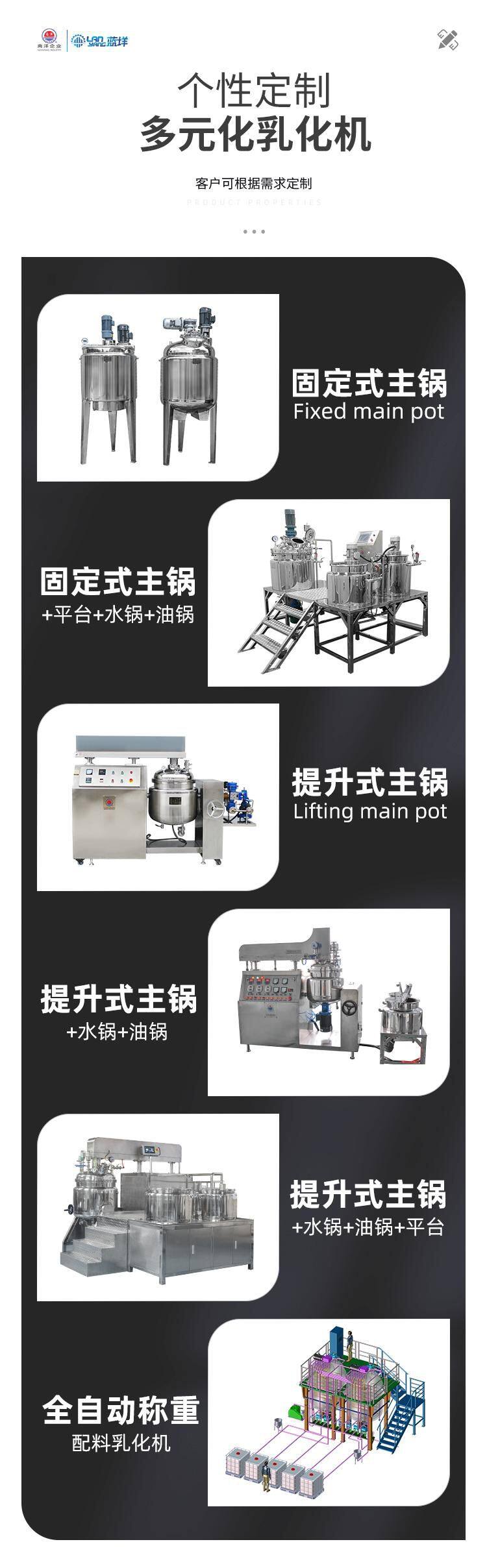 Вакуумный эмульсификатор представляет собой важное производственное оборудование для среднего и высокого класса косметики, усовершенствованное на основе передового зарубежного оборудования.