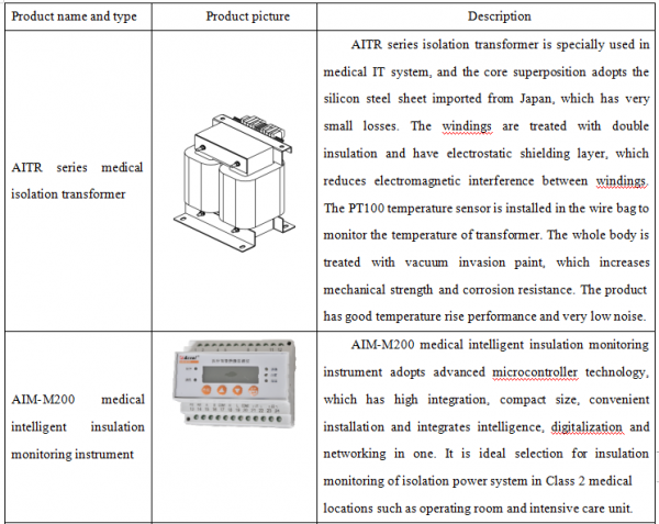 Продукты для мониторинга изоляции и локализации неисправностей медицинских ИТ-систем (семькомпонентный набор) включают трансформатор медицинской изоляции серии AITR, измеритель интеллектуального мониторинга медицинской изоляции AIM-M200, токовый трансформатор AKH-0.66P26, локатор изоляционных неисправностей AIL100-4/AIL100-8, генератор тестовых сигналов ASG100, силовой модуль DR-60-24 и централизованный прибор сигнализации и индикации AID200, которые представлены в таблице 1.