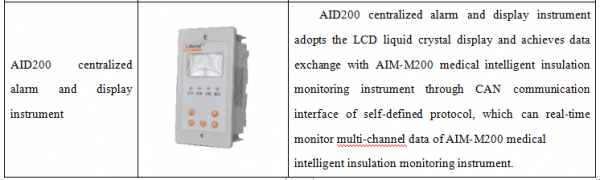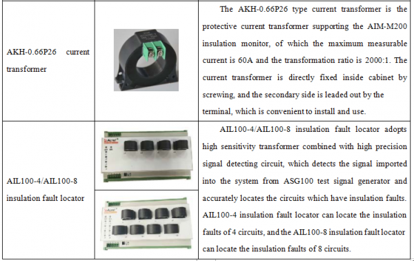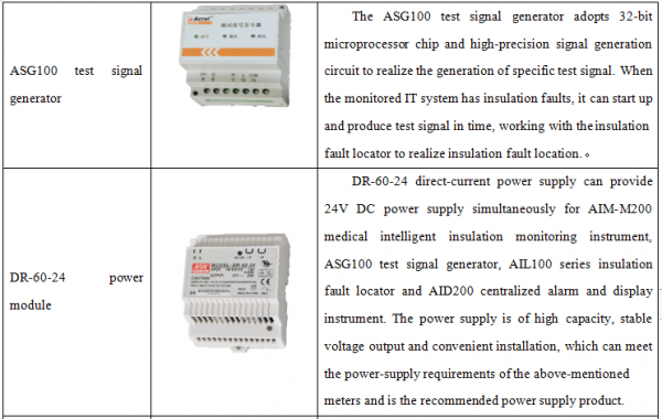 AIM-M200 обычно сочетается с медицинским изолирующим трансформатором серии AITR, трансформатором тока AKH-0.66P26, локатором поломок изоляции AIL100-4/-8, генератором тестовых сигналов ASG100, модулем питания HDR-60-24 и централизованным устройством сигнализации и индикации AID150/200.