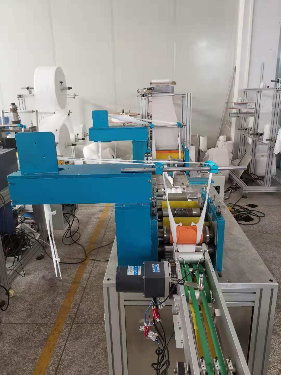 Эта машина использует ультразвук для автоматического производства готовых складных масок. Она включает специальные дополнительные функции (сварка антитуманной пленки и сварка губчатой носовой проволоки, печать), подачу носовой проволоки, сварку шнурков для накладки на уши, складывание, формование и резку, сбор мусора. Производство масок может быть завершено на одной машине. Для работы требуется только один работник.