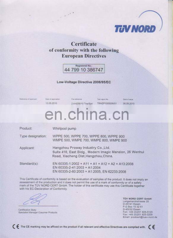 - Электрический насос с компонентами для защиты от перегрузки, изготовленными из высокопрочного материала инженерные пластики, обладающие высококачественной износостойкостью механическое уплотнение; - 63 корпус, корпус с интегрированными опорами, прочный и надежный. - Малые размеры, особенно подходят для ванн с меньшим пространством ванны; - Насос оснащен мотором, соответствующим стандарту низкого шума Однофазный с термореле от TI, США. - Мотор оснащен подшипниками для высоких температур, имеет длительный срок службы с надежностью и долговечностью. - Полное разделение воды и вала, безопасность и надежность. - Возможно использование пневматического выключателя, чтобы обеспечить легкость в использовании и безопасность. Класс изоляции F, Степень защиты IPX5. - Насос получил сертификаты CE, TUV. Условия работы - Средняя температура: 5-500C - Температура окружающей среды: ~40'C - Максимальное рабочее давление: 0.3MPa Подробности изображения 1. Водяной насос для ванной комнаты: 2. Водяной насос для ванной комнаты используется в следующей системе: Связанные продукты в наборе: (нажмите на картинки) Похожий массажный струйный насос в наборе: (нажмите на картинки) Сертификация продукта Картинка упаковки Часто задаваемые вопросы: В:Какие условия доставки вы предлагаете? В:Какие условия оплаты вы предлагаете? В:Можете ли вы поместить наш логотип на упаковку? В:Вы фабрика или торговая компания? В:Можете ли вы предоставить нам образцы? В:Какой основной порт отправки у вас? В:Какая у вас упаковка? О:В стандартных экспортных коробках, но можно проектировать по вашему запросу. В:У вас есть сертификат CE? В: Условия ценообразования? Почему большинство клиентов выбирают нас? 2. Сертификат ISO9002, форма A и маркировка CE; 3. Широкий ассортимент компонентов для ванной с гидромассажем; 4. Участие в Кантонской ярмарке каждый год; 5. Высокое качество по конкурентоспособной цене, хороший сервис и гарантия; 6. Хорошая послепродажная поддержка, быстрый отклик и оперативное решение жалоб; 7. Возможность OEM. Выставки Пробный заказ и сроки доставки: 1. За этот продукт необходимо оплатить пробный заказ, и покупатель несет расходы на доставку. 2. Время доставки обычно составляет 2 - 5 дней. Контакты Bella/Специалист по продажам Мобильный телефон: +181 5819 6972(WhatsApp можно) Телефон: +86 571 85861341, 85861342 Факс: +86 571 85861340 Skype: prowaysales3 Веб - сайт Alibaba:http://hzproway.en.china.cn/ Официальный сайт: www.hydrorelax.com