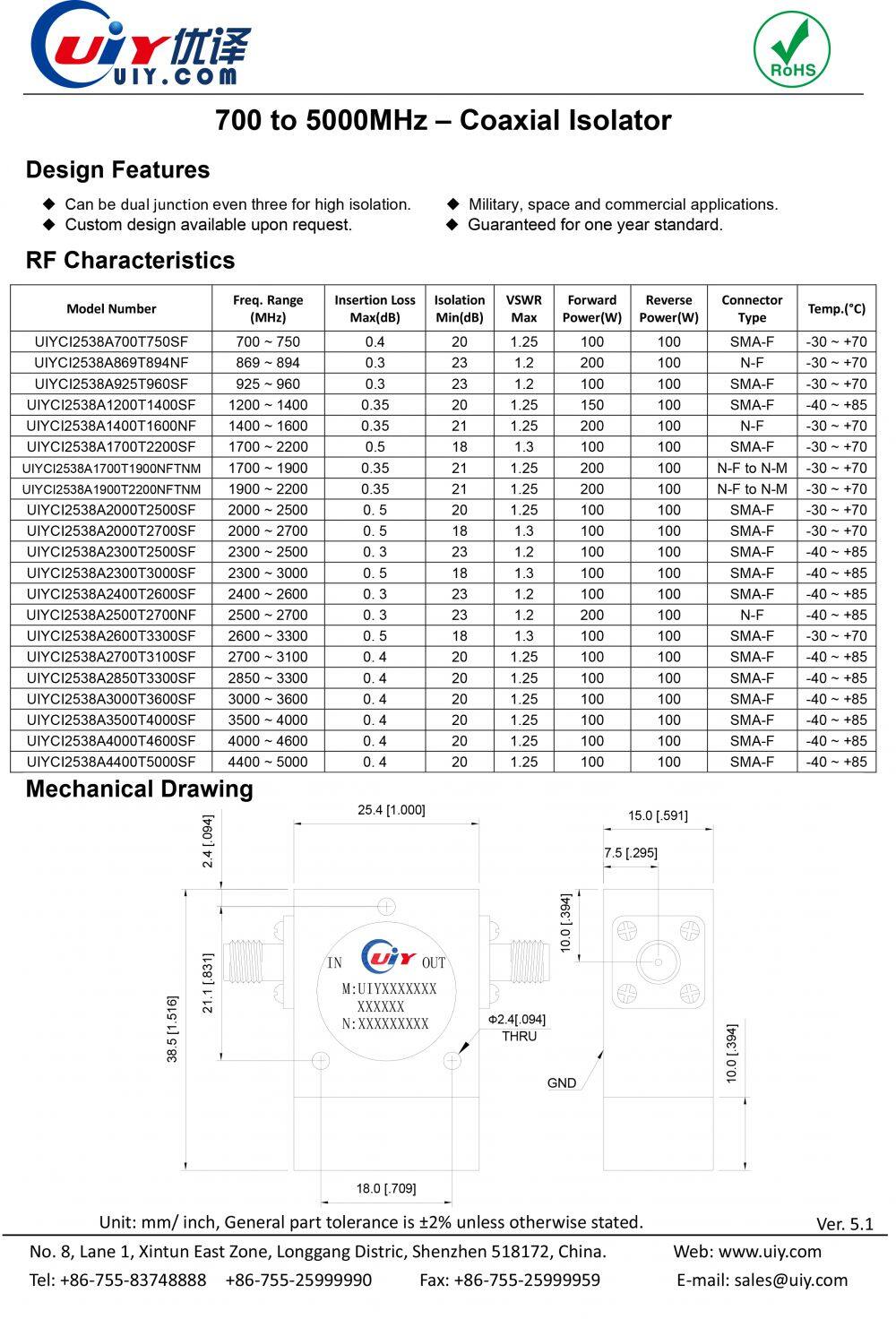 | UIYCI3538A | 200~1875 | 0.3 | 35 | 1.15 | 300 | 30 | N, SMA | -40~+85 | 35×38×15 |
