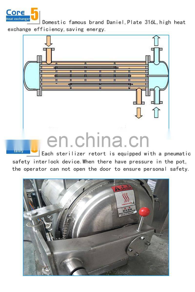Бак для распылительной стерилизации предназначен для подачи небольшого количества технологической воды до заданного уровня (не должно быть замачивания продукта) с помощью высокоэффективного циркуляционного насоса - сетчатого фильтра - высокоэффективного теплообменника в распылительную трубу, а затем через распылительные сопла распыления горячей воды в виде аэрозоля на поверхность пищевых продуктов. Теплораспределение в баке равномерное, нет зон стерилизации с "мертвыми углами". Вода нагревается и охлаждается с помощью теплообменника, скорость нагрева и охлаждения высокая, что позволяет эффективно, комплексно и стабильно стерилизовать продукты.