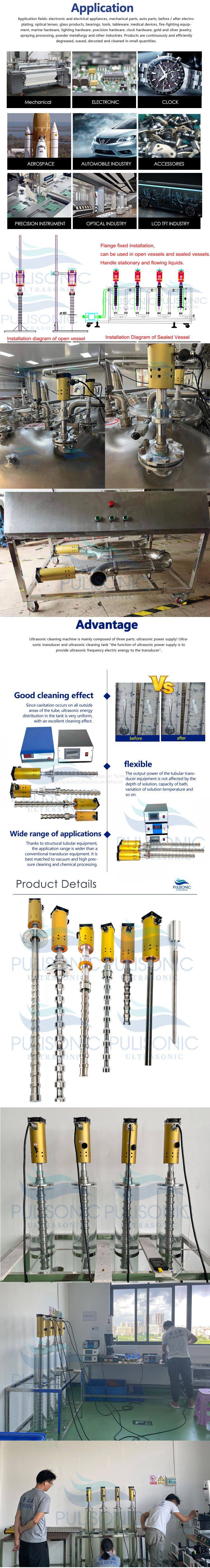 Ультразвуковой вибрирующий стержень использует высокомощный и большой амплитудный преобразователь для генерации радиальных колебаний на теле стержня. Ультразвуковые волны равномерно генерируются в радиусе 360° около вибрирующего стержня. Его амплитуда находится между амплитудой ультразвуковой мойки и процессора. Поэтому направление применения более гибкое. Ультразвуковой вибрирующий стержень можно использовать для любой мойки емкостей, его можно разместить в любой позиции ванны для мойки, он занимает небольшой объем и может быть использован очень гибко. Используя его внутри реактора, можно ускорить растворение, ускорить реакцию и предотвратить накипь на внутренней стенке.
