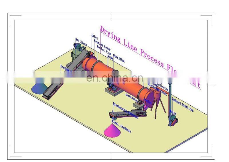 Материал должен быть отправлен в корпус через загрузочную камеру и загрузочный желоб. Затем материал будет толкаться назад спиральной лопастной пластиной. Поскольку сушильный аппарат установлен с наклоном, материал течет к концу под действием силы тяжести и вращения, в то же время он многократно поднимается лопастной пластиной вверх, а затем постоянно опускается, образуя равномерный занавес в барабане и полностью обмениваясь теплом с горячим потоком в барабане. По мере того, как материал многократно поднимается и рассеивается, влага постепенно выпаривается. В конце концов он полностью высушивается.