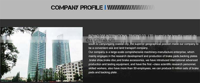Rizhao DSS Auto Spare Parts Co., Ltd - это объединение завода и торговой компании, занимающейся производством и разработкой тормозных колодок, тормозных башмаков и аксессуаров.