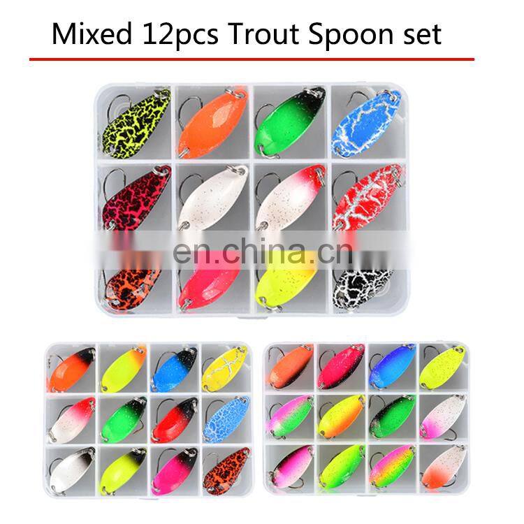 Главная > Продукты > Приманка для рыбалки > 12 штук/коробка Набор металлических приманок типа лодочки для форели в смешанных цветах. Приманки для рыбалки в пресной воде, искусственные приманки для рыбалки в озере