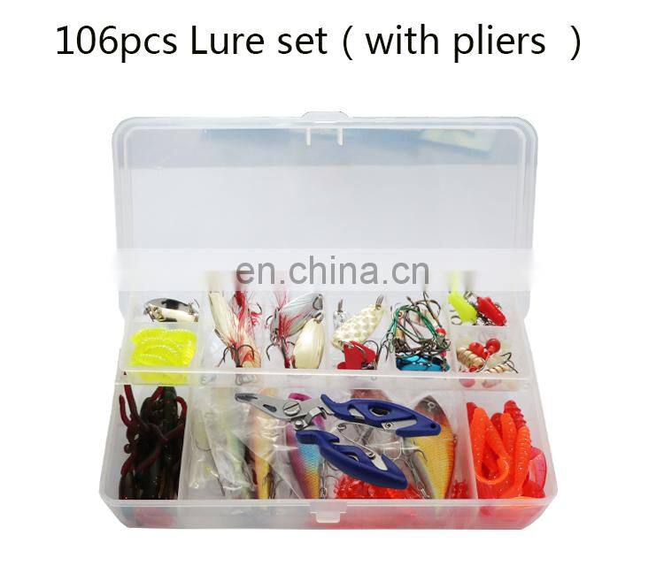 Главная > Продукты > комплект рыболовных приманок > Быстрая доставка 106шт/набор amazon На заказ Смешанный набор рыболовных приманок Минноны Воблеры Кренкбаиты Твердые приманки Прикормки Искусственные рыболовные приманки