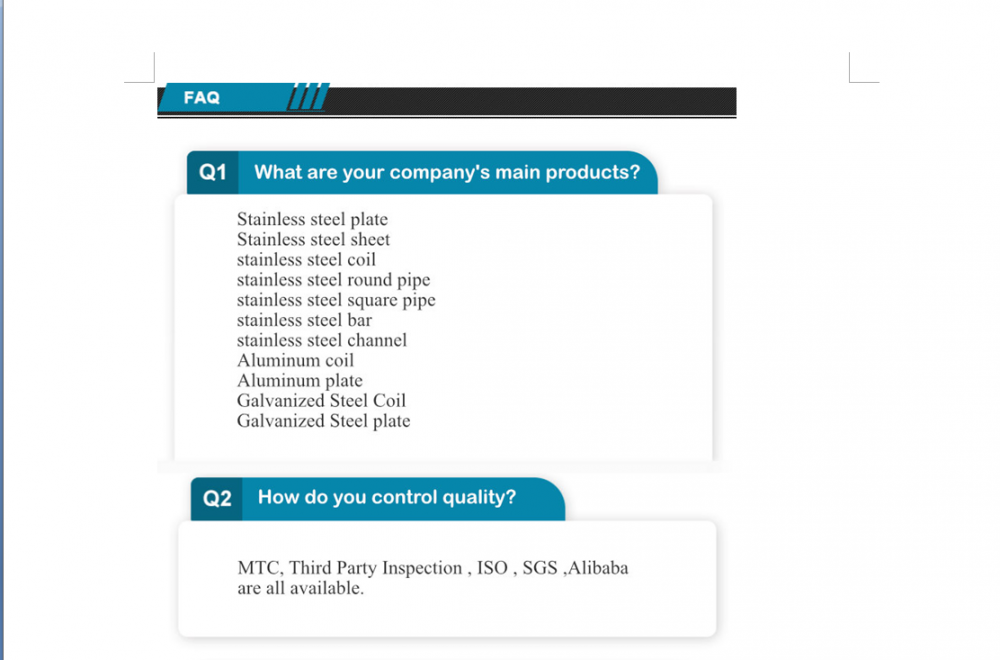 - Основные продукты: стainless steel sheet, stainless steel plate, оцинкованная листовая сталь, оцинкованный рулон, листовая сталевый сплав, трубка из сплавной стали, гофрированная плита, низкоуглеродистая сталь, алюминиевый лист, алюминиевый рулон, противоизносная пластина