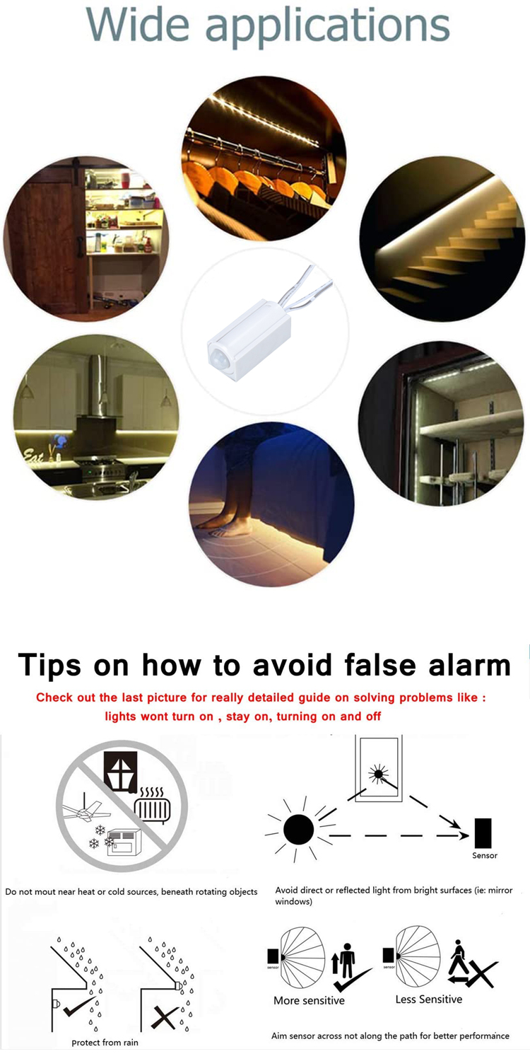 О товаре: Датчик движения PIR: Он может обнаруживать движение человека, обнаружая инфракрасное излучение, испускаемое человеческим телом. Диапазон обнаружения в виде конуса 120 градусов. Интеллектуальное обнаружение, он автоматически отключается с задержкой после того, как человек уходит. Время задержки 30 секунд.